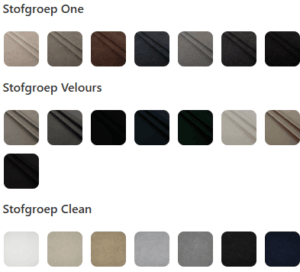Kleur | Clean/bruin, Clean/donkerblauw, Clean/donkergrijs, Clean/ivoor, Clean/lichtgrijs, Clean/zand, Clean/zwart, Kunstleer/camel, Kunstleer/cognac, Kunstleer/donkerbruin, Kunstleer/grafiet, Kunstleer/groen, Kunstleer/kiezel, One/antraciet, One/blauw, One/bruin, One/creme, One/kiezel, One/lichtgrijs, One/zwart, Velour/antraciet, Velour/blauw, Velour/lichtgrijs, Velour/zwart, Velours/groen, Velours/ivoor, Velours/taupe |